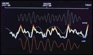 شكل (3) يبين دورة الطقس كيف تمر الأرض بمراحل ترتفع فيها درجة الحرارة (النقاط الحمراء) ثم تنخفض فيها الحرارة إلى ما دون الصفر (النقاط الزرقاء)، وذلك خلال النصف مليون سنة الأخيرة من عمر الأرض. إذن هنالك دورة وعودة متكررة لحالة الطقس على الأرض.