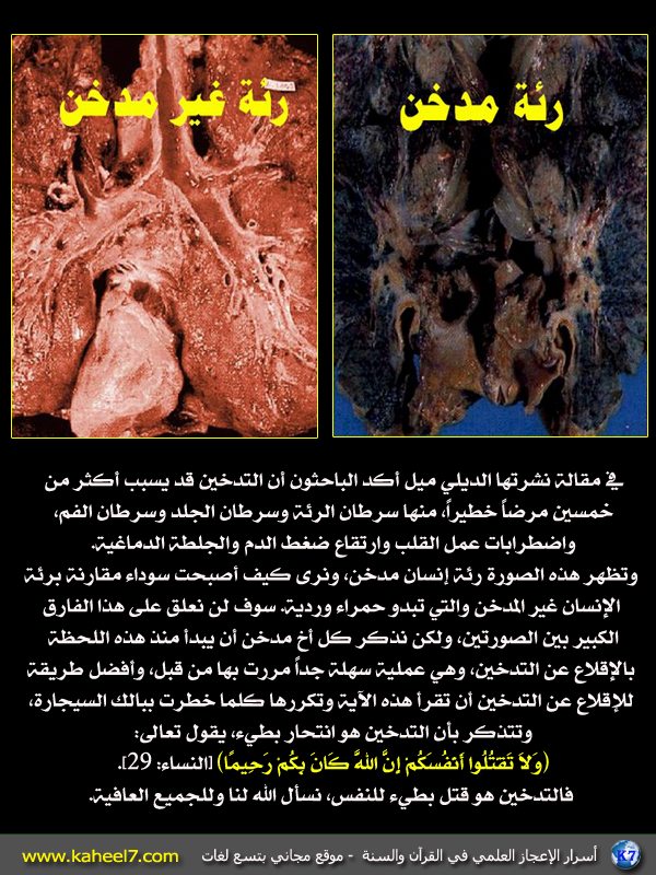 رئة المدخن تبدو سوداء مظلمة متآكلة ضعيفة لا تصمد أمام الأمراض ومهيأة للإصابة بالسرطان… ولكن ماذا عن رئة غير المدخن؟…