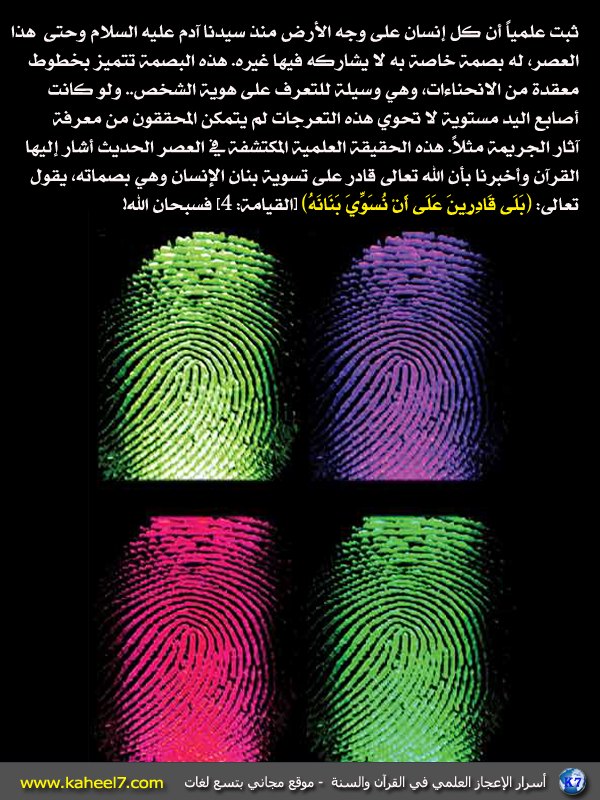 تحدث القرآن في إشارة لطيفة إلى بنان الإنسان وهي بصمات الأصابع، وجاء العلم ليكتشف أن كل إنسان له بصمته الخاصة….