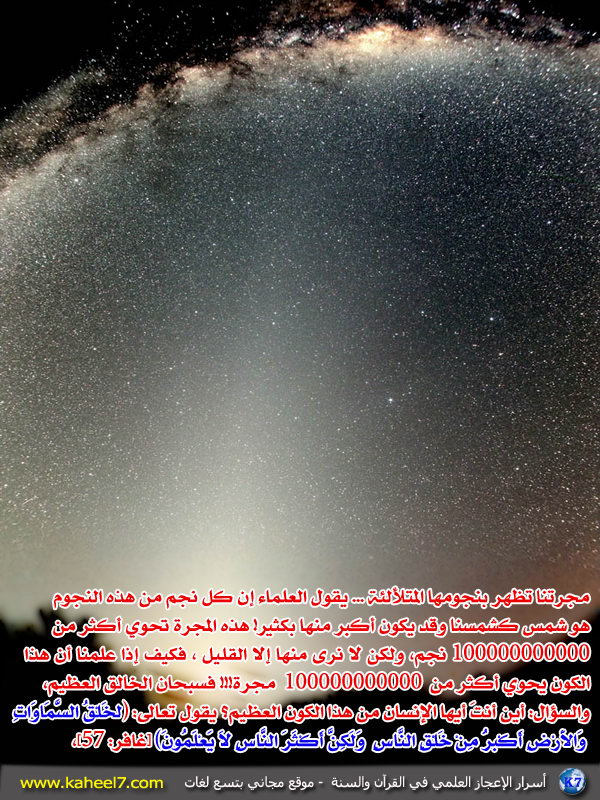 إنه كون واسع جداً لا يعلم حدوده إلا الله تعالى، وهذه صورة لمجرتنا التي نعيش فيها تظهر بنجومها الرائعة… لنسبح الله تعالى….