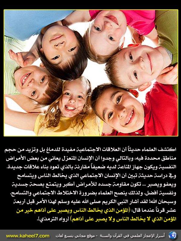 في بحث علمي جديد وجد العلماء أن العلاقات الاجتماعية تزيد حجم الدماغ، ومفيدة لصحة نفسية وجسدية … وهذا ما أخبر به النبي الكريم….