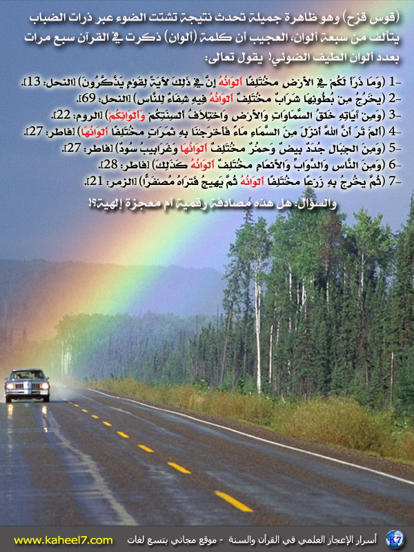 » صورة وآية الألوان والرقم سبعة كلمة (ألوان) تكررت في القرآن الكريم فهل من علاقة بين عدد ألوان الطيف الضوئي وتكرار هذه الكلمة، لنقرأ ….