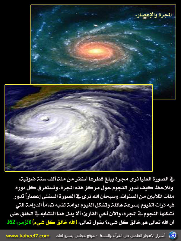 » صورة وآية صورة تشهد على وحدانية الله: المجرة والإعصار في كل شيء في هذا الكون نرى حقيقة علمية تدل على أن الله واحد أحد، لنتأمل صورة المجرة وصورة الإعصار…
