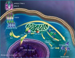 صورة لخلية بشرية موضح عليها العمليات الدقيقة التي تتم أثناء موت الخلية، ونلاحظ أن العملية تشترك فيها معظم أجزاء الخلية وفق خطوات مقدرة ومحسوبة. ويحتار العلماء كيف يمكن لخلية لا تعقل أن تقوم بهذه العمليات المنظمة والمعقدة دون أن تقع في خطأ واحد!! المصدر: www.biooncology.com