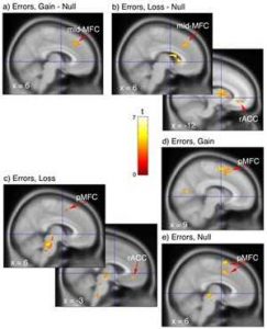 في هذه التجربة وجد العلماء أن مقدمة الدماغ وتحديداً في قشرة الدماغ الأمامية وتسمى rACC وهي ما نسميه “الناصية” تكون أكثر نشاطاً عندما يرتكب الإنسان خطأ ما! وكلما كان الخطأ أكبر كانت هذه المنطقة أنشط.